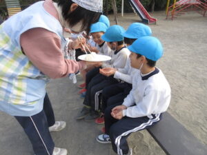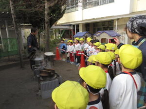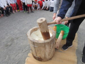 12月の風物詩の“お餅つき” かまどに火を焚き餅米を蒸します。 園長先生がある程度までお餅をついてくれます。みんなで応援! 「甘くておいしい〜」蒸したての餅米を試食。 「よいしょ!よいしょ!」と元気な声が。 白くてモチモチのお餅の出来上がり! Post Share LINE RSS Pin it note 12月未就園児イベントのお知らせ 前の記事